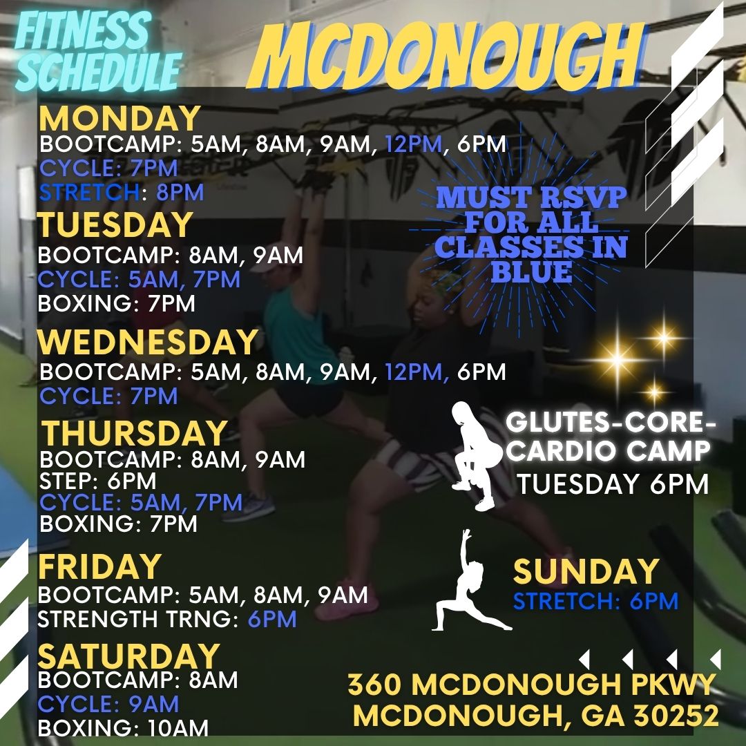 Our Classes Include: Group Fitness (Bootcamp, Cycle, Boxing, Glute Class, Strength Training, Step, Stretch). We also offer Personal Training, Small Group Training, VIRTUAL training & Golf Fitness Training. In-Home Training available by Appointment.